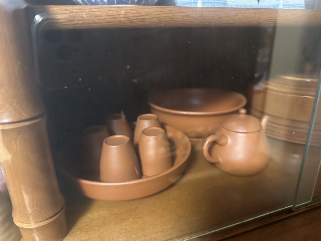 赤みがかった素焼きの質感が美しいもので、中国茶器のような雰囲気を漂わせていました。小ぶりの湯呑みが複数揃っており、長年飾り棚に納められていたようです。