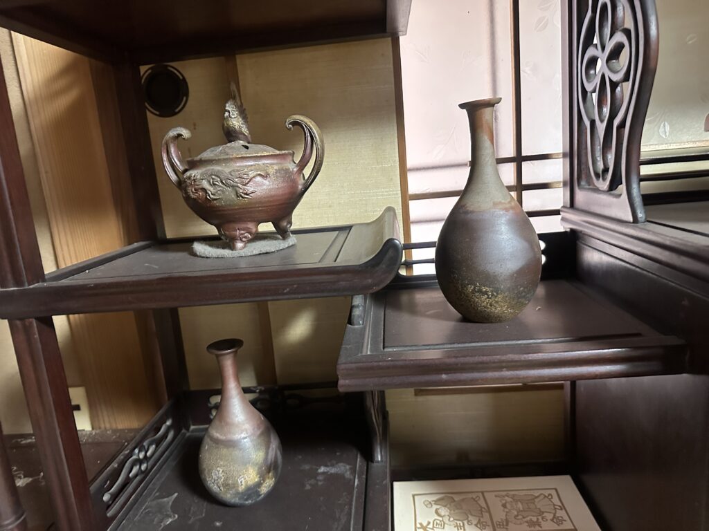 倉敷市広江にて、長年空き家となっていたご実家の売却に伴う整理で見つかった骨董品・美術品の買取事例|備前焼の花入れ・木彫り像・朱泥急須セット・金製アクセサリーなど