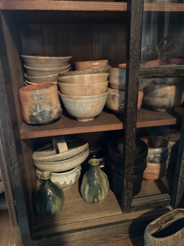 棚に並んでいた茶碗やぐい呑み、酒器類。備前焼や志野風の器など、多彩な焼き物が揃い、日常使いから観賞用まで幅広い魅力を持つ陶器でした。