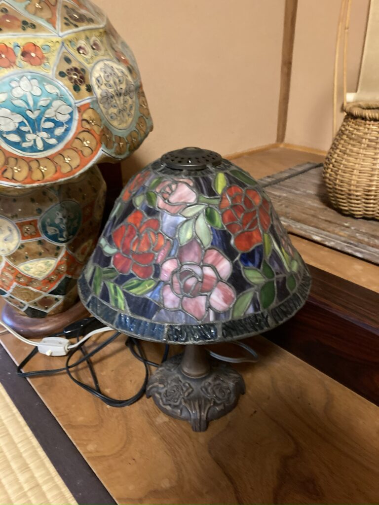 華やかな花柄のステンドグラスランプ。アンティーク家具と相性が良く、インテリア骨董として人気のあるアイテムです。