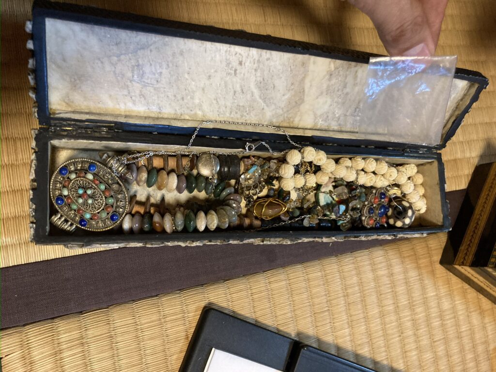 漆箱の中からは、天然石や装飾金具をあしらったネックレスが複数見つかりました。アンティークジュエリーとしての価値があり、海外テイストの意匠も含まれるコレクションでした。