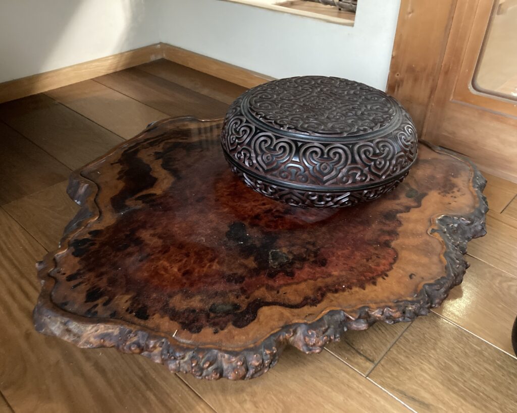 繊細な堆朱での彫りが施された茶櫃と、自然の杢目が美しい飾台。床の間や茶席を彩る美術品として評価できました。